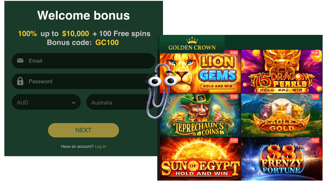 🚀 Golden Crown Casino | This real money casino gives its players the opportunity to receive one of the highest welcome bonuses on their first deposit only – 10,000 Australian dollars + 100 free spins (or 6,000 euros). | 40x |
